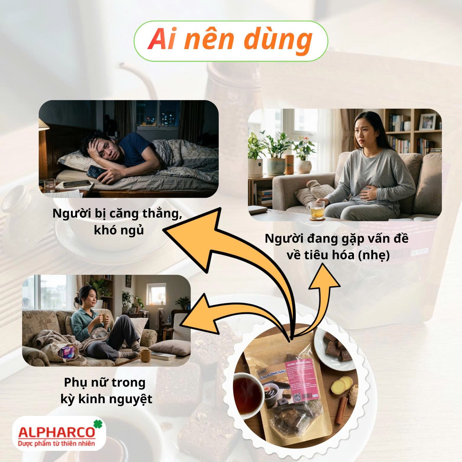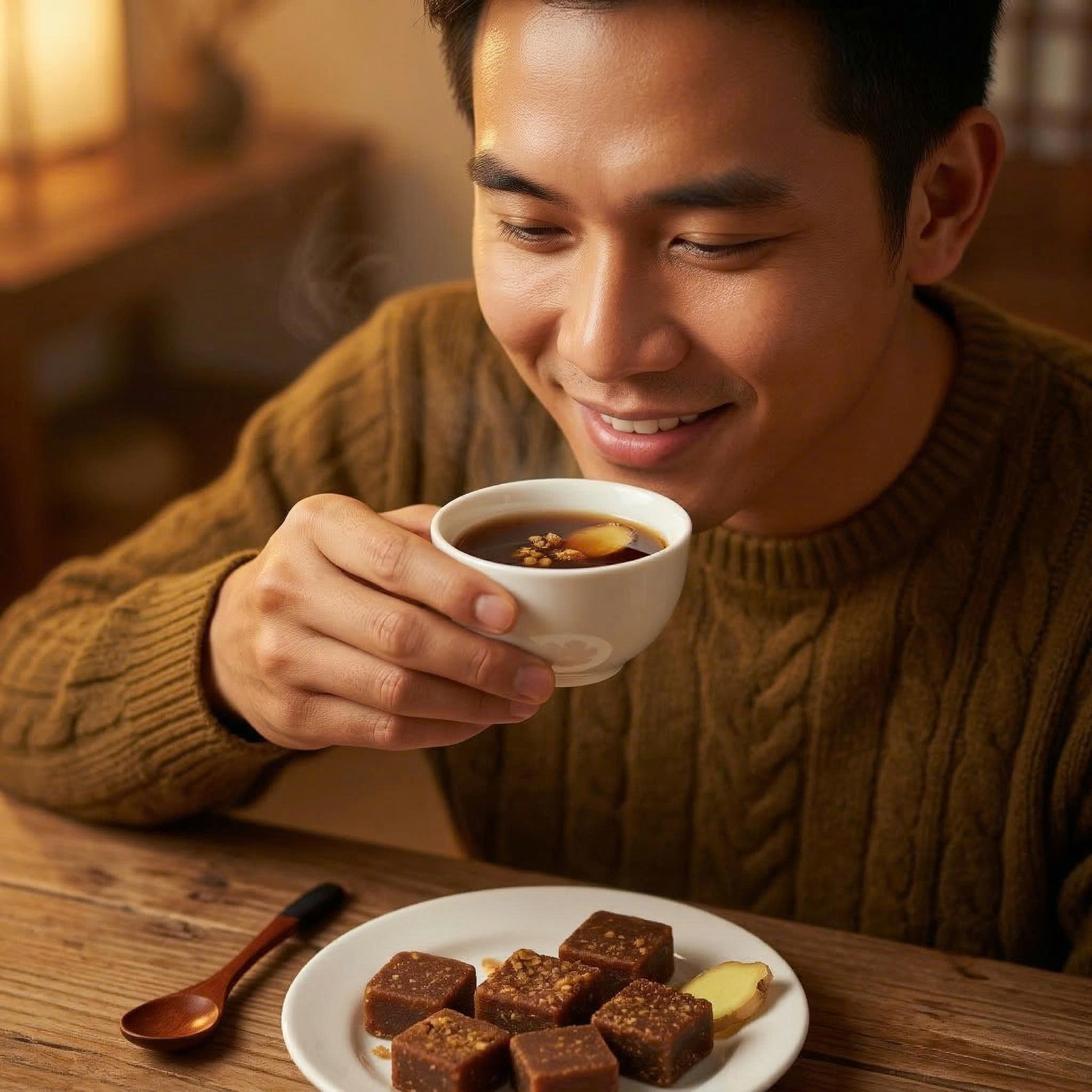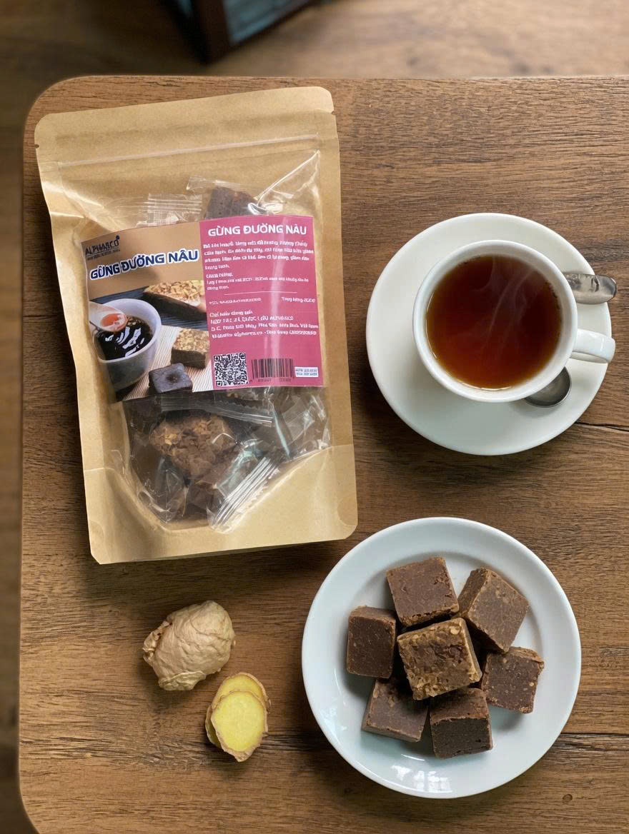 - Dùng 1 viên gừng đường nâu pha với khoảng 200 – 300ml nước nóng (80–90°C), khuấy tan rồi thưởng thức